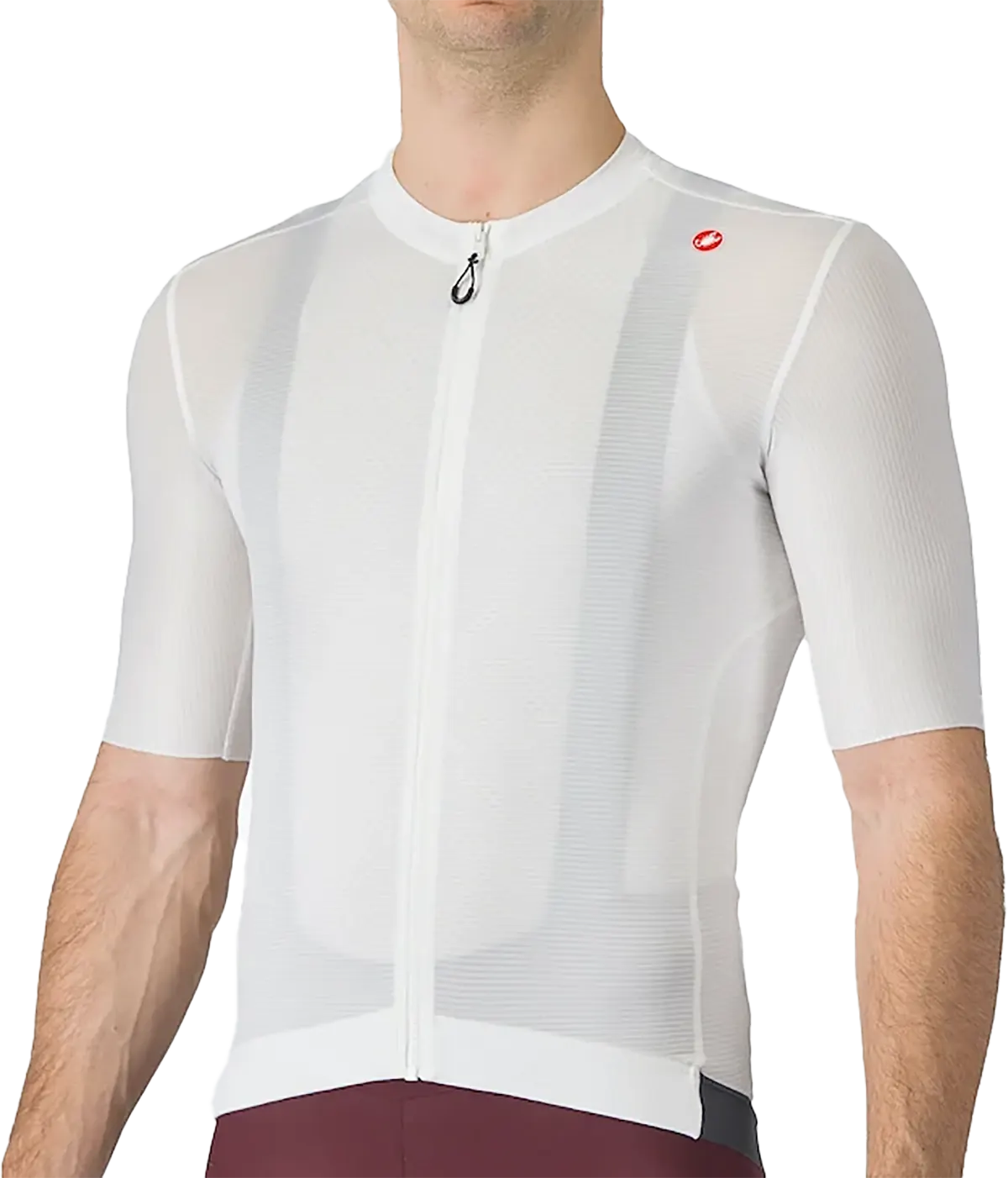 Din nye yndlingsjersey. Castelli-udviklet Air_O Stretch-stof for åndbarhed, komfort og perfekt pasform Stof optimeret til åndbarhed og aerodynamik Råskårne ærmekanter for komfort Tre baglommer med en fjerde lynlåslomme til værdigenstande Lynlås i fuld læn