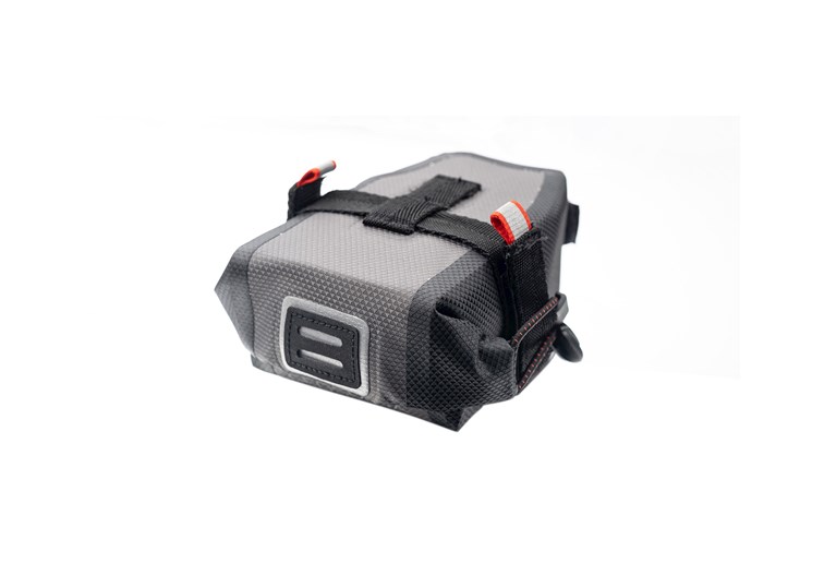 Taskens stive konstruktion og varmeforseglede søm gør den en ekstra solid og 100% vandtæt. Tasken tilpasser sig sadelpinden ved hjælp af de forstærkede Velcro®-stropper, som bruges til at montere den med.